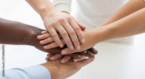 Fototapeta premium Diverse hands stacked together, symbolizing unity, teamwork, and...