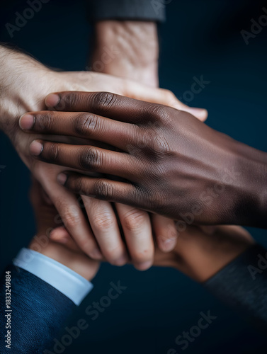 Fototapeta premium Diverse hands unite, symbolizing collaboration, teamwork, and unity in a professional setting. Together we achieve more.