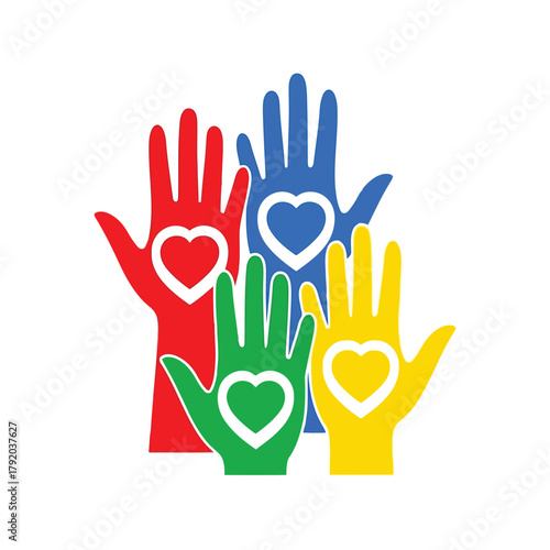 Fototapeta premium Diverse hands with hearts symbolizing love, unity, and support isolated on white background, Vector