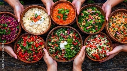 © tugkiara, Fototapeta premium Diverse healthy salads shared, overhead view, rustic table, healthy eating