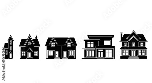 Fototapeta premium Diverse house silhouettes showcasing architectural styles for real estate, construction, and urban planning illustrations and design projects