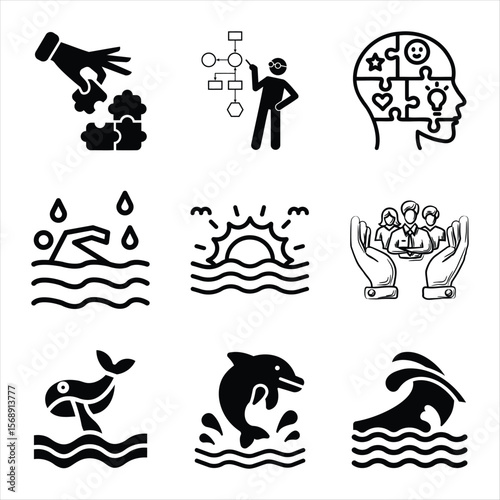 © Md Yunos, Naklejka premium Diverse Icon Set Featuring Teamwork,Problem Solving,Environmental Awareness And Mental Wellness Depictions
