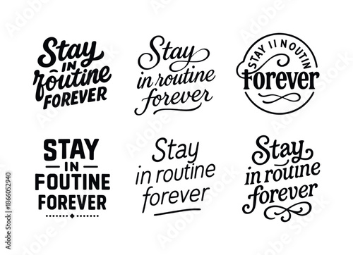 Fototapeta premium Diverse Lettering Styles. Stay in routine forever. Set lettering. harmonious lettering variations of the same emblematic concept, each with different artistic