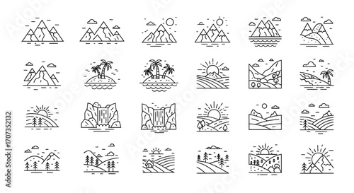 © Maryam, Fototapeta premium Diverse linear nature scenes capture mountains, islands, waterfalls, and sunrises for design projects