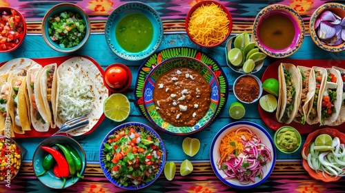 © Viktoriia, Fototapeta premium Diverse Mexican Cuisine Spread on Blue Textured Surface with Hands Sharing the Meal