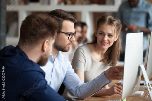 Fototapeta premium Diverse millennial employees coworking discussing business project or idea in shared office, smiling colleagues work together at pc, male worker explain to coworkers pointing at computer screen