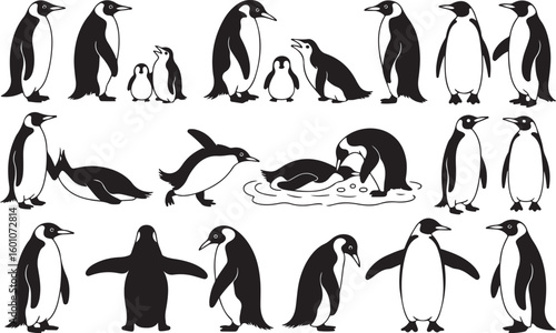 Fototapeta premium Diverse penguins in various poses and interactions birds wildlife