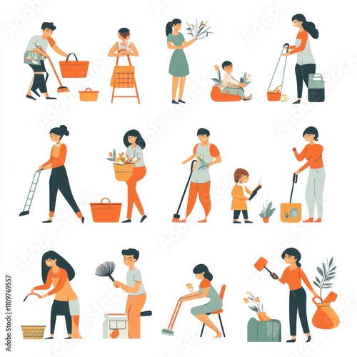 Naklejka premium Diverse people spring cleaning home, chores, housework.