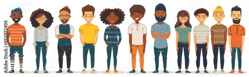 Naklejka premium Diverse people standing in line on white background smiling, cartoon style...