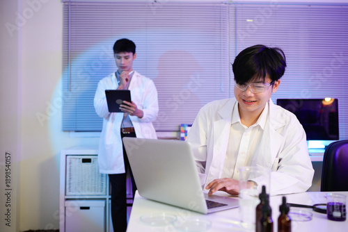 Obraz premium Diverse scientists collaborating in a modern laboratory, conducting research with a laptop, microscope, and chemical experiments