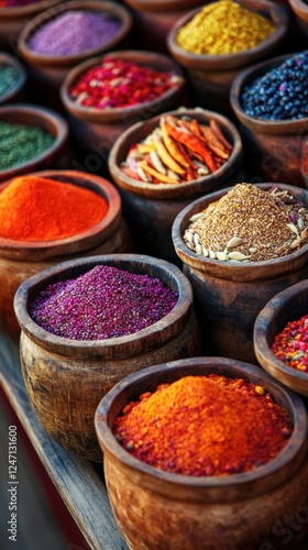 Fototapeta premium Diverse spices in wooden bowls displayed at vibrant market