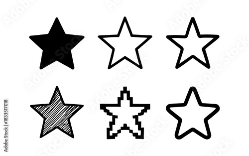 Fototapeta premium Diverse star icons collection: solid, outline, sketch, pixel, and more