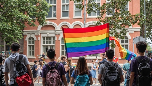 © Ruben, Obraz premium Diverse students holding pride flag at school
