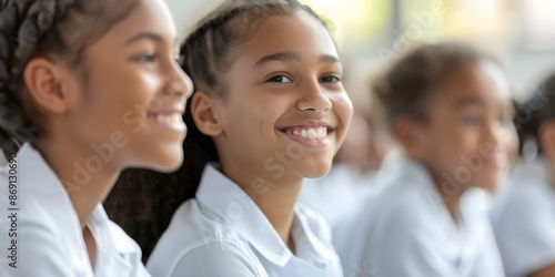 © Anastasiia, Fototapeta premium Diverse students in uniform happily chatting at tables enjoying inclusive education. Concept Education, Diversity, Inclusion, Students, School