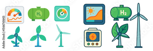 Fototapeta premium Diverse symbols representing renewable energy sources and hydrogen technology...