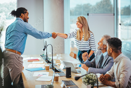 © Dragana Gordic, Fototapeta premium Diverse Team Celebrating Success with a Handshake in Office