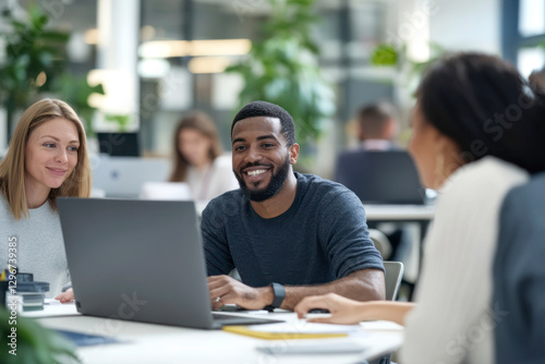 Fototapeta premium Diverse team collaborating and smiling in a modern office.
