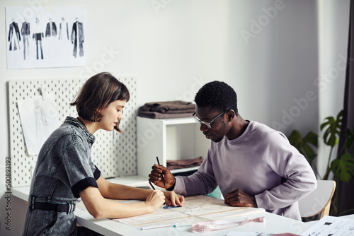 Obraz premium Diverse team of garment designers creating new sewing patterns for upcoming collection