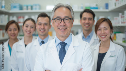 © Jari.art, Fototapeta premium diverse team of pharmacists smiles confidently in pharmacy setting, showcasing professionalism and teamwork