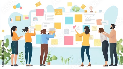 Fototapeta premium Diverse team using smart tools for collaborative project planning, illustration