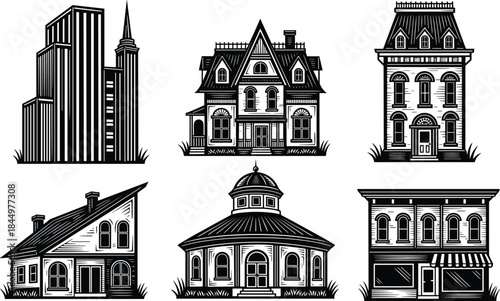 Fototapeta premium Diverse Vector Building Collection, Vintage House Illustrations and Skyscraper Graphic, Old Town Victorian Home, Urban Storefront, and Modern Architectural Elements Set.