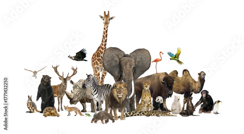 © Eric Isselée, Fototapeta premium Diverse wild zoo animals including mammals, birds, and reptiles stand together in a large group against a transparent background