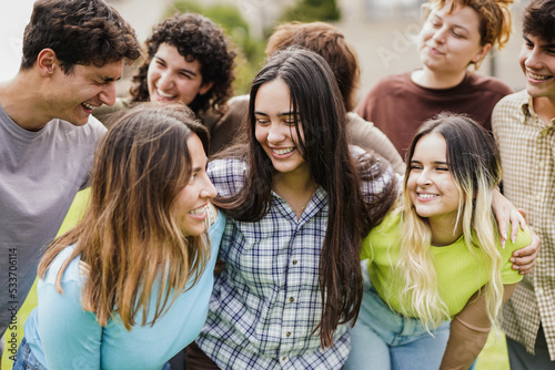 Naklejka premium Diverse young people having fun outdoor - Cheerful students outside of...
