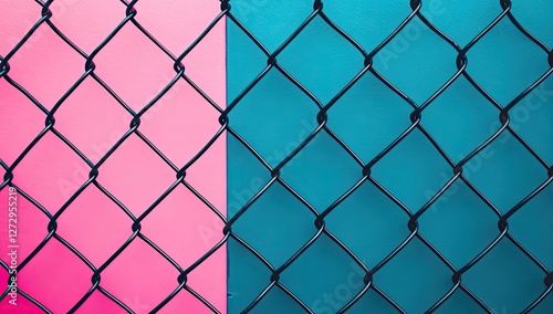 Fototapeta premium Divided wire fence, vibrant pink and teal background