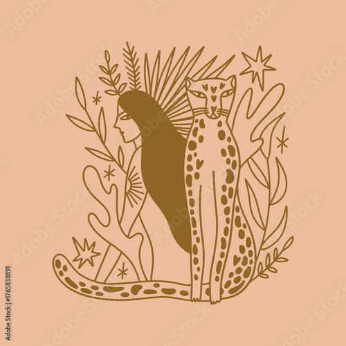 © Knstart Studio, Naklejka premium Divine doodle modern abstract goddess woman with wild cat leopard vector clip-art illustration. Boho sacred magic jungle line art logo or label. Mystical symbol, flat holistic vector drawing. Healing