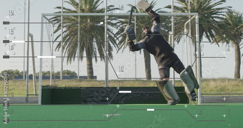 Fototapeta premium Diving to right blocking shot on field hockey turf, with net and protective...