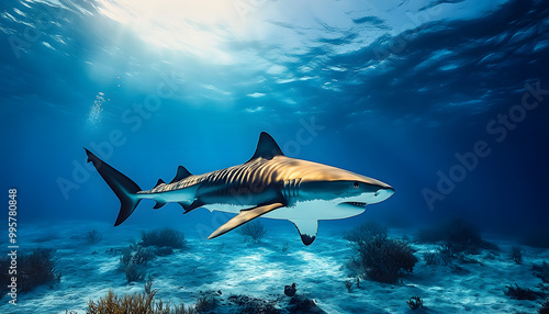© Daniel, Fototapeta premium diving with big tiger shark underwater in blue transparent ocean