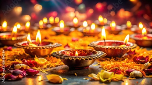 Obraz premium Diwali celebration with beautifully lit diyas and scattered flower petals , Diwali, celebration, lit diyas, flower petals