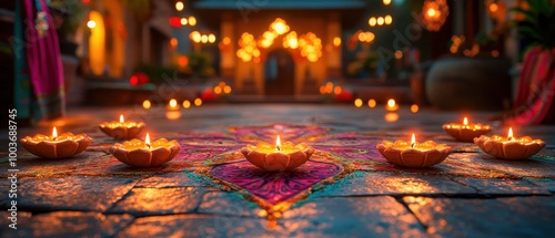 © Tomass, Obraz premium Diwali celebration with illuminated diyas on colorful rangoli in an outdoor courtyard at night