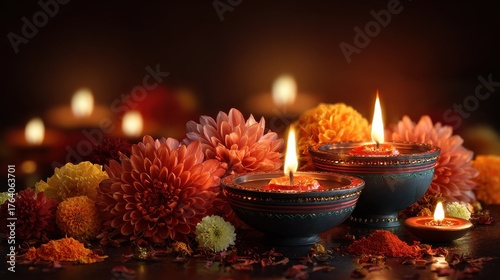 © Johannes, Obraz premium diwali celebration with oil lamps and flower decorations