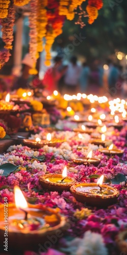 © Diffin, Naklejka premium Diwali diya oil lamps with flowers holiday background. Creating a festive and decorative composition.