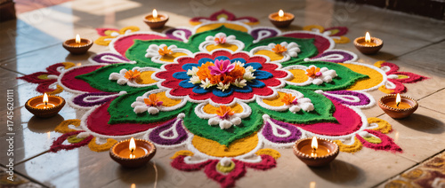 © aiximagination, Fototapeta premium Diwali Flatlay Advertisement Tiled Floor Rangoli Patterns Colored Powders Flower Petals Diyas Natural Light Vibrant Colors Cultural Artistry