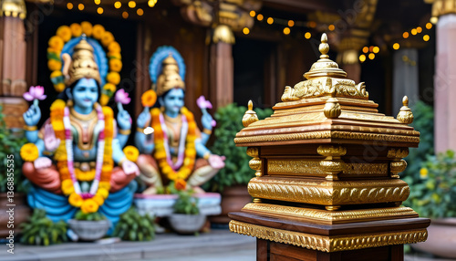 © aiximagination, Fototapeta premium Diwali product display podium background, Temple of Prosperity, wooden, gold leaf detailing, traditional Indian temple courtyard, Goddess Lakshmi and Lord Ganesha, marigold garlands, lotus flowers