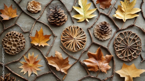 Fototapeta premium DIY decorations crafted from natural materials, leaves, and twigs forming intricate patterns