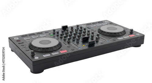 Fototapeta premium DJ controller with knobs, sliders, and decks on dark surface, angled view