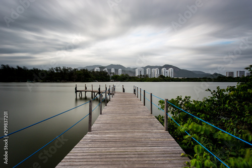 Fototapeta premium Długa ekspozycja molo w spokojnym jeziorze, otoczona naturą, woda jest...