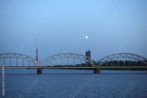 Naklejka premium Długi metalowy łukowy most kolejowy przez rzekę Dźwinę w Rydze na tle samodzielnego budynku, wieży telewizyjnej i jasnego księżycowego widoku do przodu na Sunsetsky