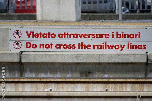 Fototapeta premium Do not cross the railway lines - Warning sign in train station