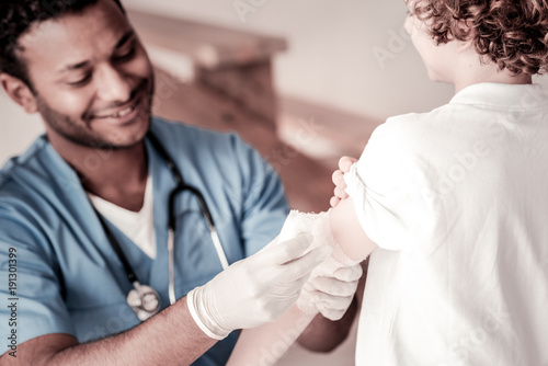 © zinkevych, Obraz premium Do not worry. Selective focus on a curly haired boy standing while a smiling physician putting a bandage on his arm.