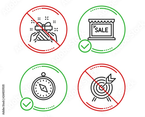 Obraz premium Do or Stop. Gift, Travel compass and Sale icons simple set. Archery sign. Present, Trip destination, Shopping store. Attraction park. Holidays set. Line gift do icon. Prohibited ban stop. Good or bad