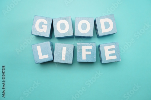 © may1985, Obraz premium Dobre życie utworzone z liter alfabetu kostki na niebieskim tle