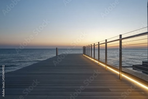 Naklejka premium Dock at sunset on ocean, walkway with modern illuminated railing, beautiful...