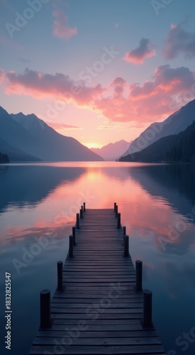 © kramynina, Fototapeta premium Dock on a lake with mountains in the background