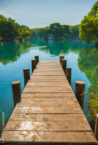 © Marco, Naklejka premium Dock on Lake Camecuaro Michoacán, Mexico, with its amazing turquoise waters, where the roots of the ahuehuete trees reach the lagoon.