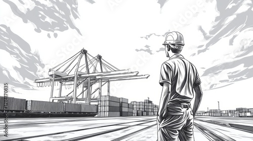 Obraz premium Dock Worker Overseeing Cranes and Cargo Containers in Monochrome Illustration