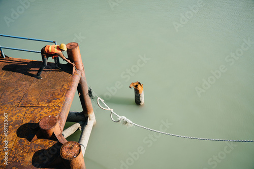 © galaganov, Obraz premium Docker at the wharf takes the mooring end. Old pier.